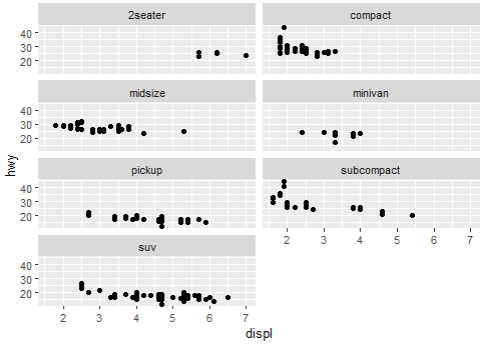 > p <- ggplot(mpg, aes(displ, hwy)) + geom_point()