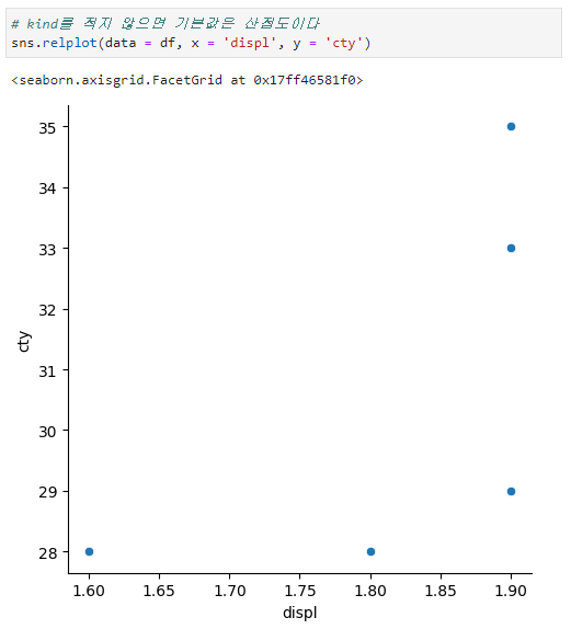 ※ kind를 적지 않으면 default값은 산점도그래프(scatterplot()) 이다.