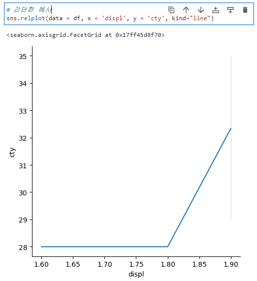 산점도(scatterplot()) 와 lineplot()의 상위 개념 함수이다. relplot()을 이용하면 산점도와 선 그래프 모두를 그릴 수 있고, 두 그래프의 문법을 그대로 다 사용할 수 있다. 단지 scatter plot을 그리고 싶다면 relplot(kind="scatter") 을 line plot을 그리고 싶다면 relplot(kind="line")을 입력하면 된다.