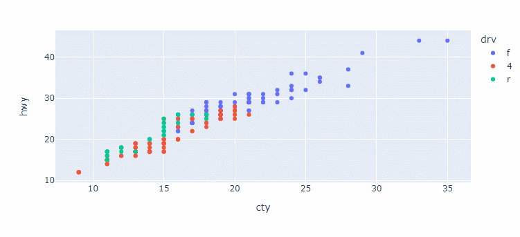 # 구동 방식(drv) 별로 배기량(displ)에 따른 도시연비(cty) 그래프를