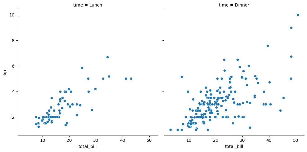 sns.relplot(data=tips, x="total_bill", y="tip", col="time")