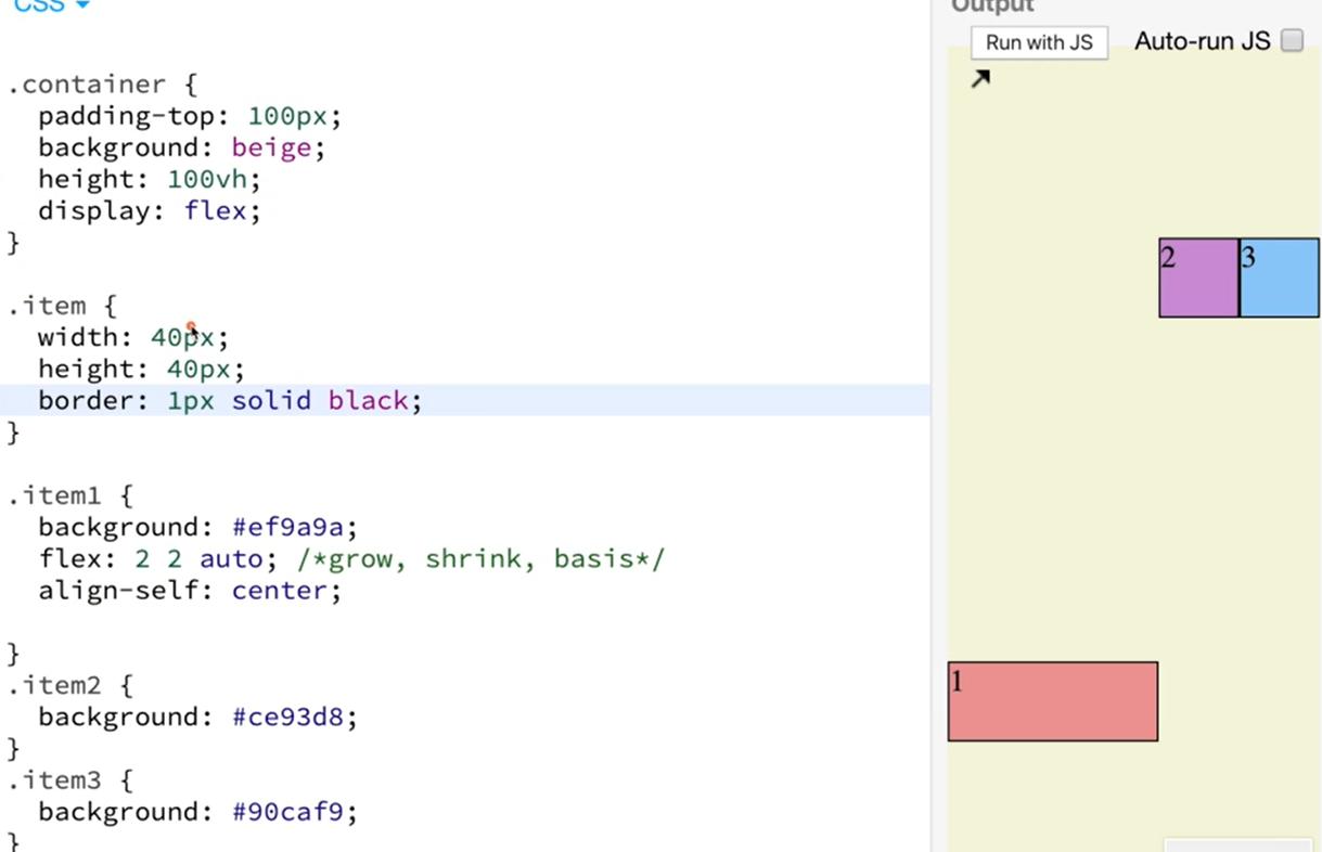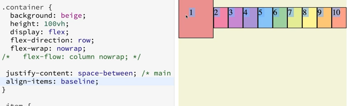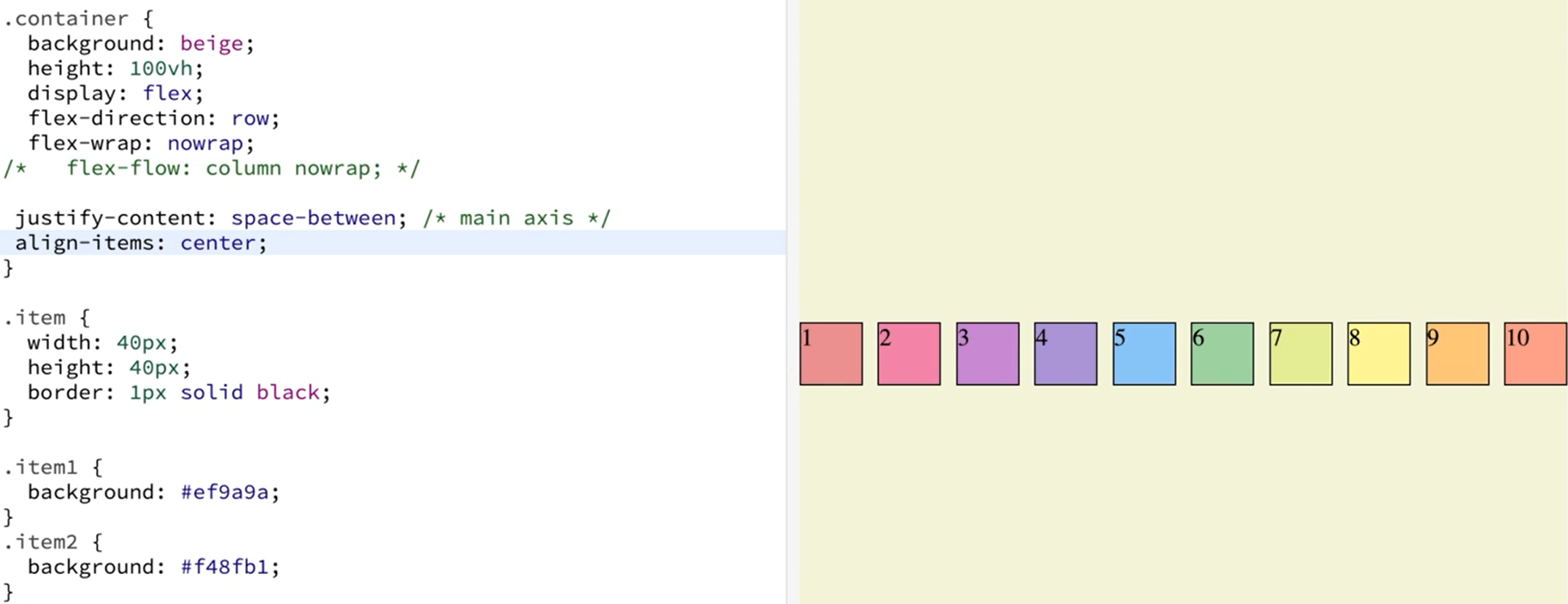 flex-start;가 기본값. 중심축이 row이면 아이템을 왼쪽을 기준으로 정렬/ column이면 위를 기준으로 정렬