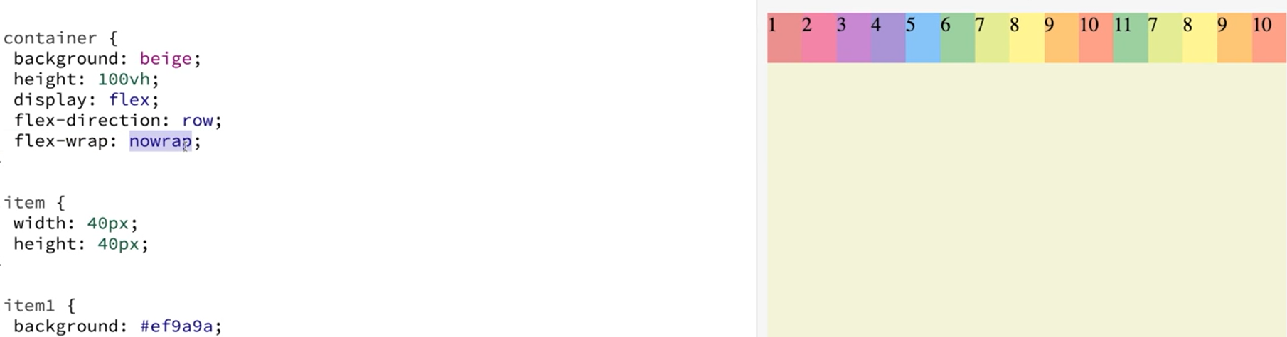 flex-wrap: nowrap; 기본값은 nowrap, 아무리 아이템이 많아도 한줄에 위치