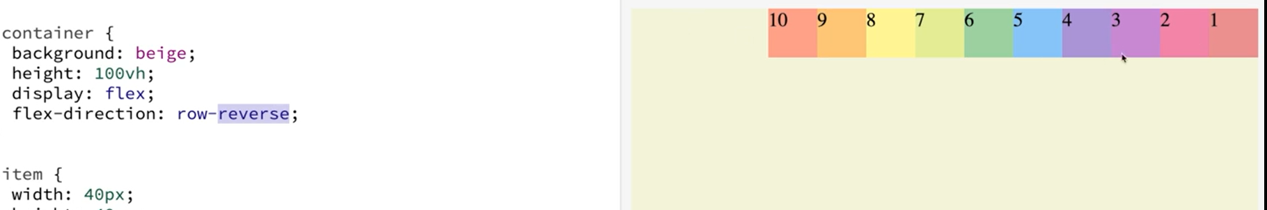 flex-direction: row-reverse; 오른쪽에서 왼쪽으로 수평 배치(중심축이 수평)