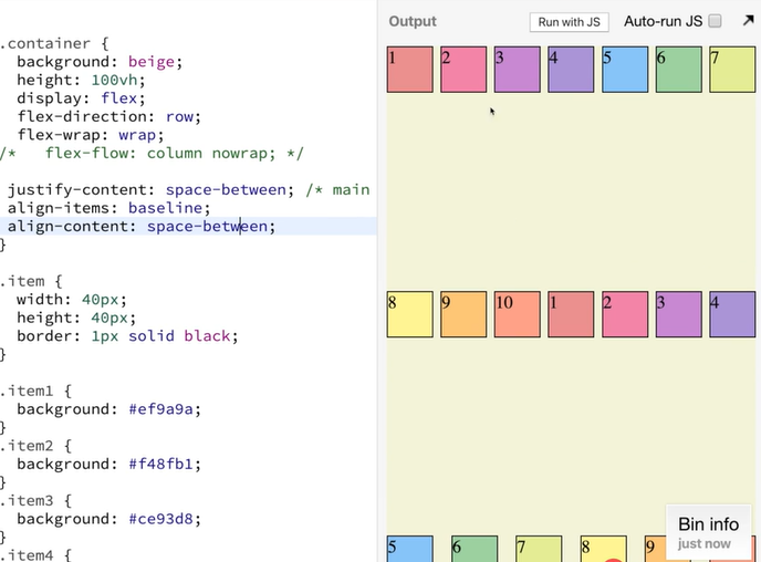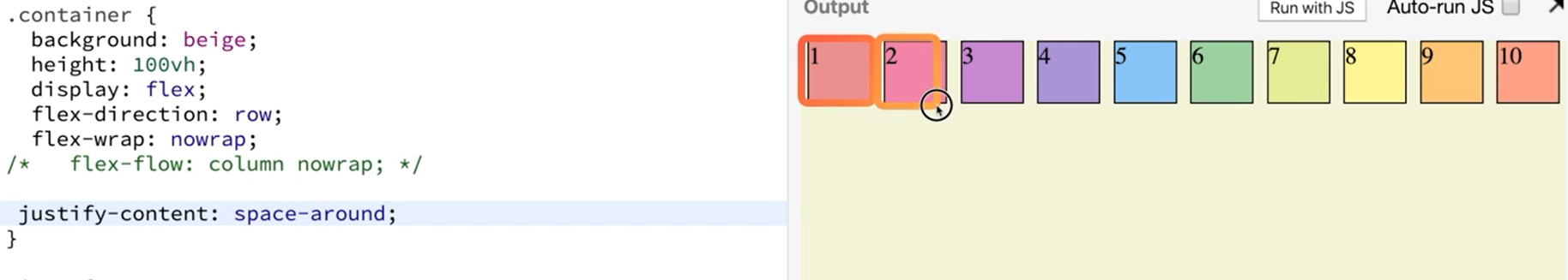 space-around; 박스를 둘러싼 스페이스를 넣어줌. 박스기준으로 동일하게 넣어주므로 1번과 10번처럼 박스사이가 아닌 바깥간격은 좁음
