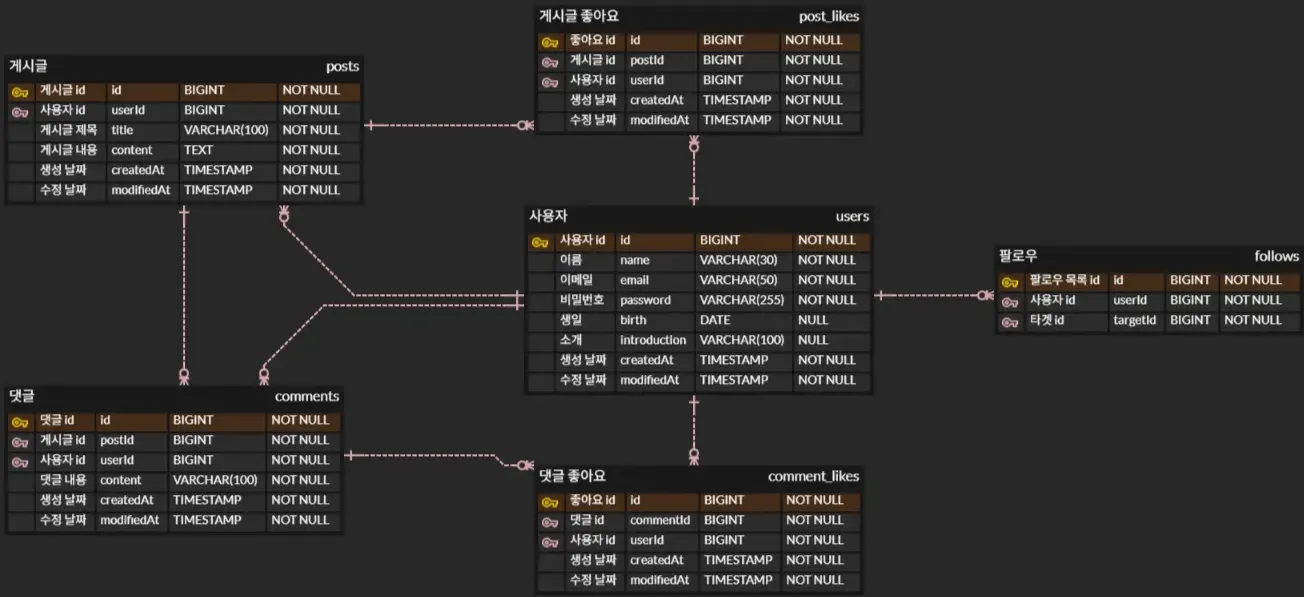 각 API별 데이터 흐름과 로직 설계를 위해 가볍게 ERD 속성들과 연관관계를 이어주었다.