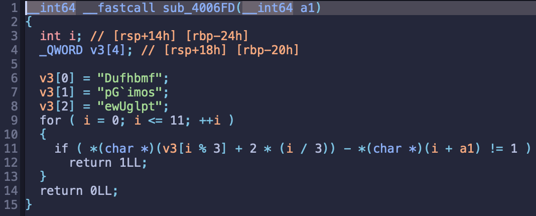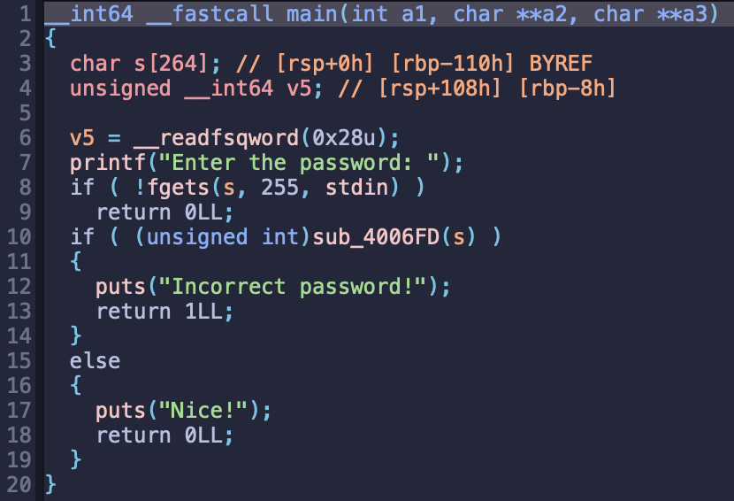 fgets 함수로 데이터를 입력받고, 입력받은 데이터를 인자로 sub_4006FD 함수를 실행해서 값을 체크해서 결과를 출력해주는 간단한 바이너리다.