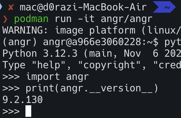 podman run -v $(pwd)/angr-examples:/home/angr/angr-examples -it angr/angr