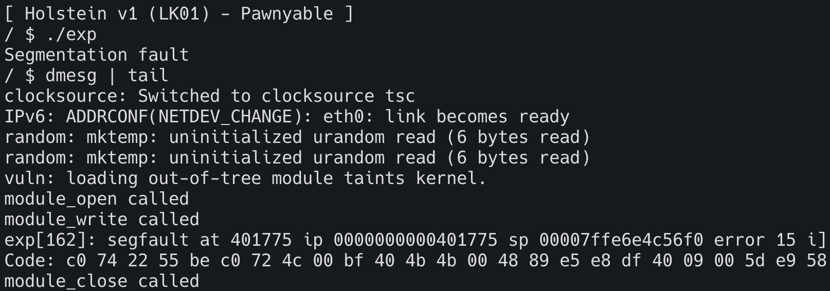 이전에 사용했던 페이로드를 그대로 실행해보면 Segmentation fault 가 발생하는 것을 볼 수 있다.