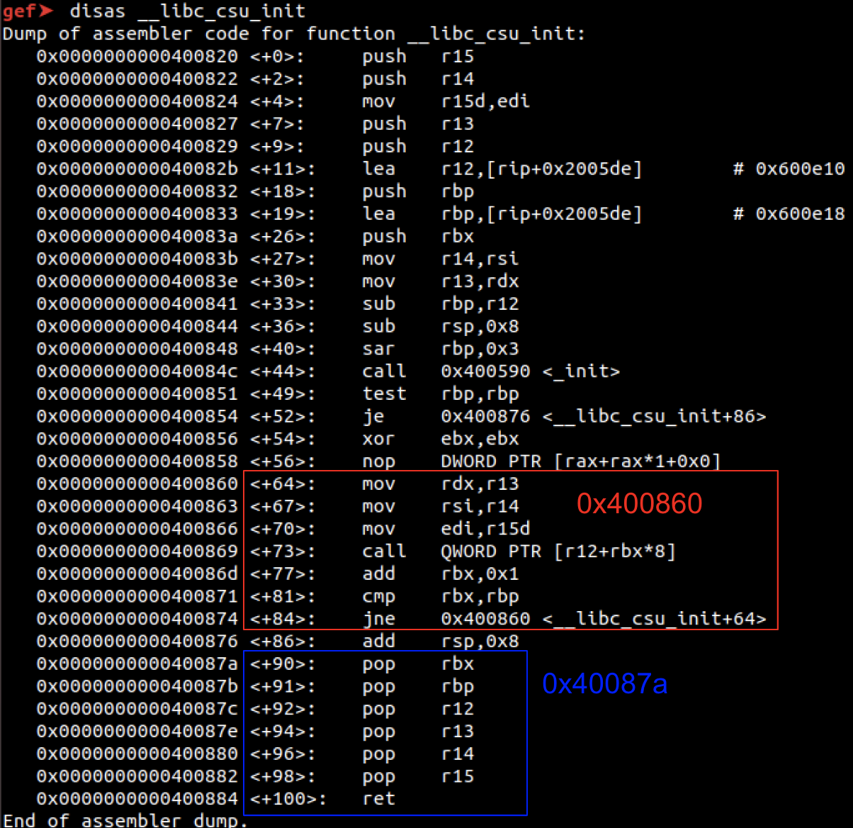 rbx에 0을 넣고 r12에 원하는 함수의 got 주소를 입력해주면 됩니다.