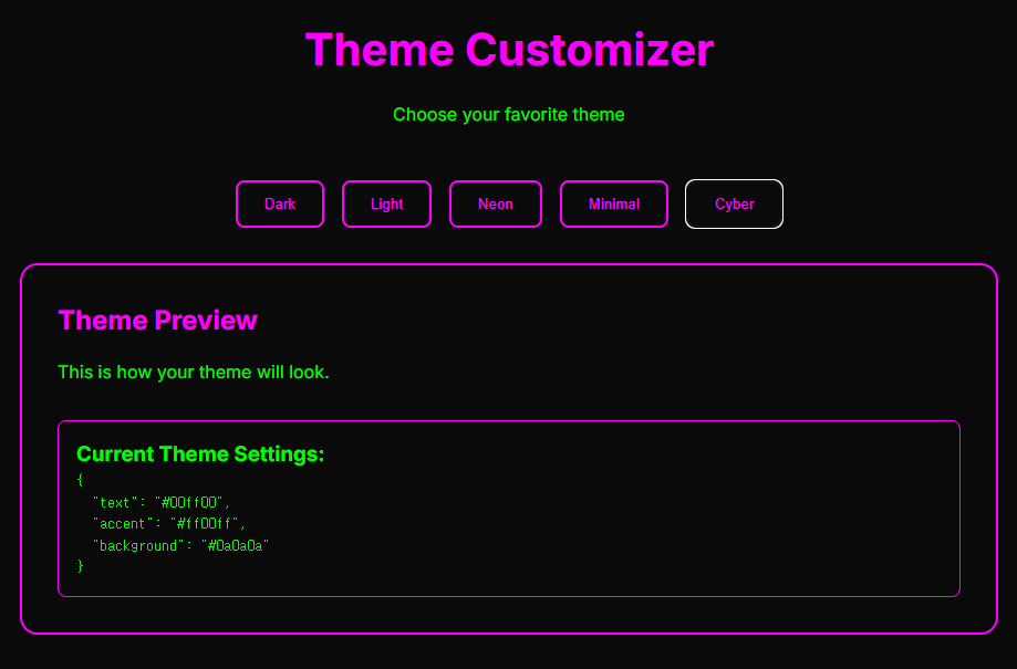{"theme_name":"dark","theme_settings":"{\\"text\\": \\"#ffffff\\", \\"accent\\": \\"#00ff9d\\", \\"background\\": \\"#1a1a1a\\"}"}