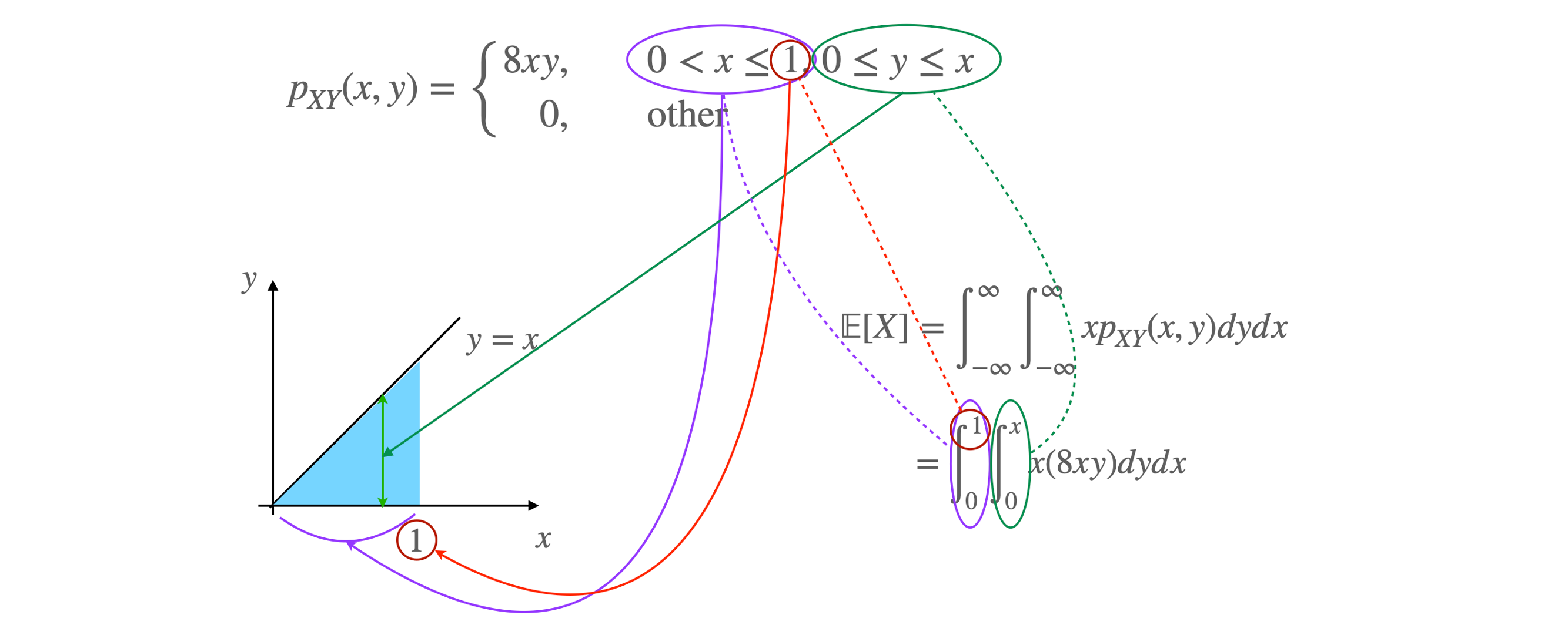 E[X]=∫−∞∞∫−∞∞xpXY(x,y)dydx=∫01∫0xx(8xy)dydx=∫01[4x2y2]0xdx=∫014x4dx=54
