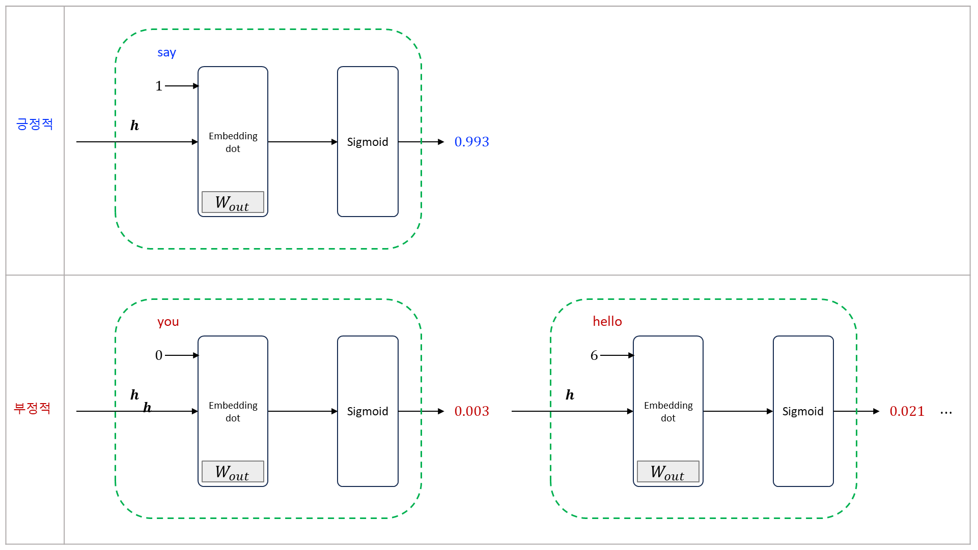 긍정적 예 (”say”) 에 대해서는 지금 까지 처럼 Sigmoid with Loss layer 에 정답 label 로 “” 을 입력한다. 한편, 부정적 예 (”hello” 와 “I”) 에 대해서는 (부정적 예) 이므로 Sigmoid with Loss layer 에 정답 레이블로 “” 을 입력한다. 그런 다음 각 데이터의 손실을 모두 더해 최종 손실을 출력한다.