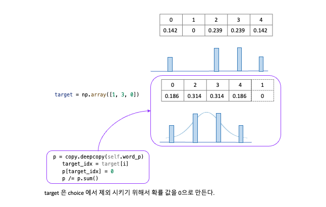 또한 UnigramSampler class 는 get_negative_sample(target) 메서드를 제공한다.