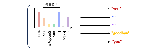 corpus 에서의 단어 빈도를 기준으로 샘플링하려면, 먼저 corpus 에서 각 단어의 출현 횟수를 구해 ‘확률 분포’로 나타낸다. 그런 다음 그 확률 분포 대로 단어를 샘플링하면 된다.