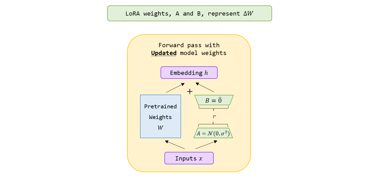 훈련 초기에 와 가 backpropagtion 을 통해 업데이트 되기 전, 이면 으로 LoRALayer 는 원래의 가중치에 영향을 가하지 않기 위해서 이다.