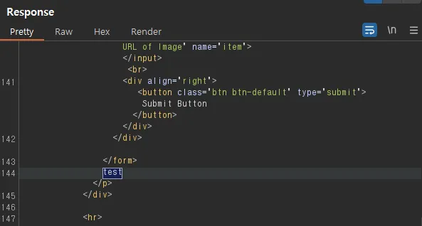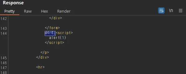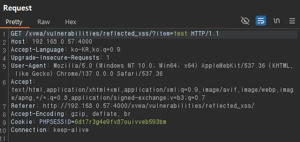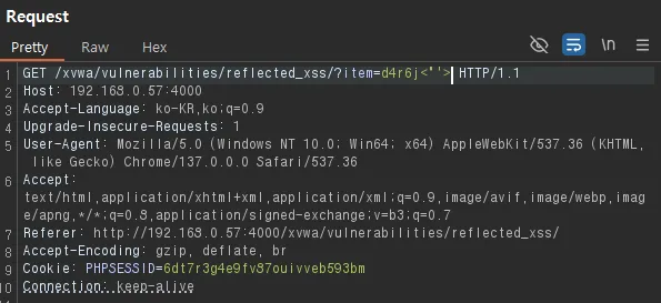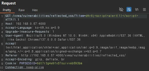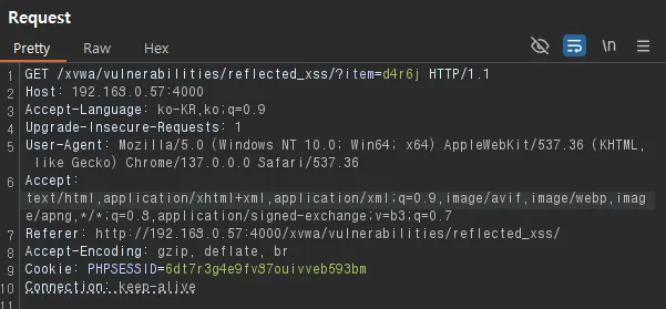 내가 입력한 데이터를 요청하여 응답에 나오면 된다. Reflected XSS 의 특징이다.