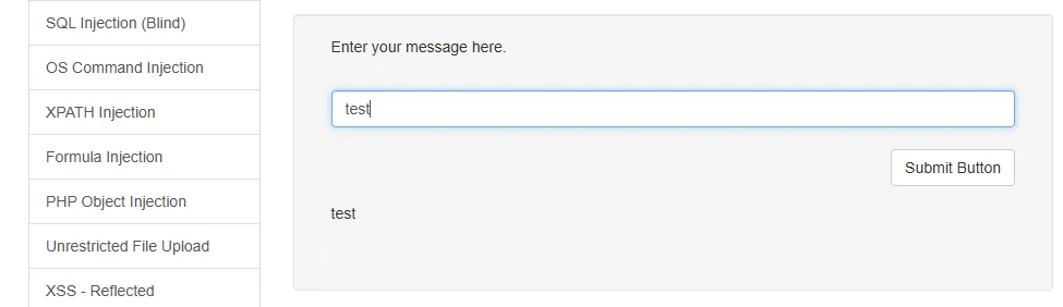 XSS-Reflected 에서 test 라고 하고 Submit 을 하면 test 가 나오게 된다.