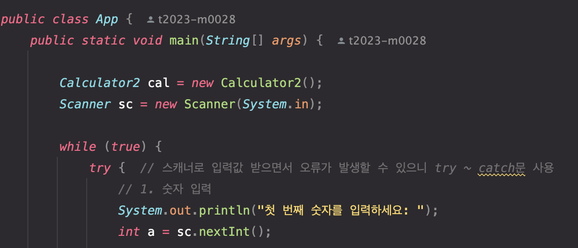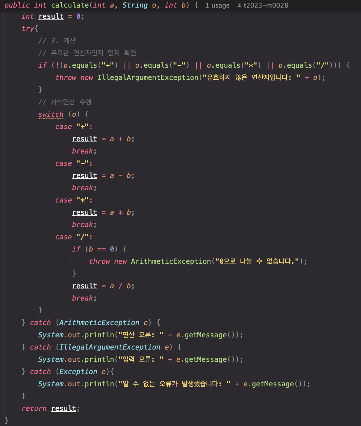 숫자 2개와 연산자 1개를 받아 사칙연산을 수행하는 계산기를 만드는 과제를 진행하고 있는데, try ~ catch 를 사용하여 예외처리를 해보았다.