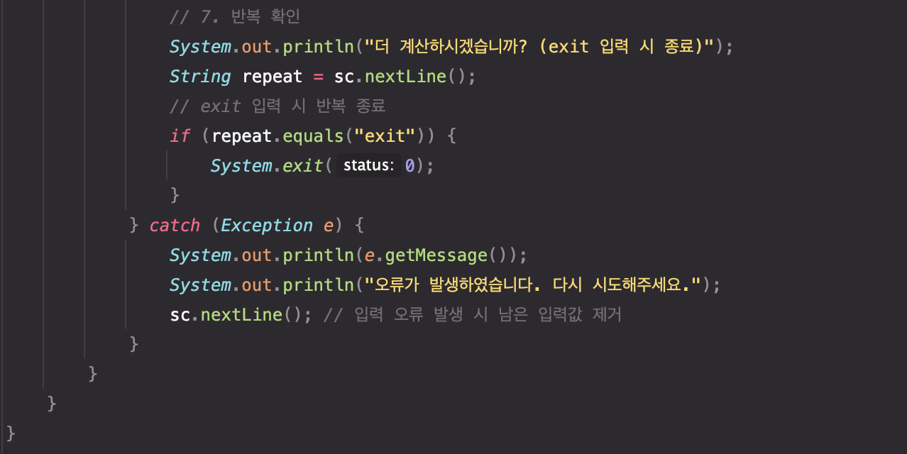 예상치 못한 예외가 발생하였을 때, 비정상 종료 없이 계산기를 계속 실행할 수 있도록 하였다.