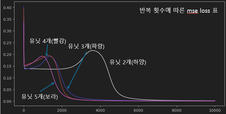 유닛 개수가 많아질 수록 loss값이 줄어드는 반복 횟수의 임계값이 적어짐을 알 수 있었다. 따라서 유닛 개수가 많다면 학습이 더욱 빠르게 이루어진다고 추측할 수 있다.