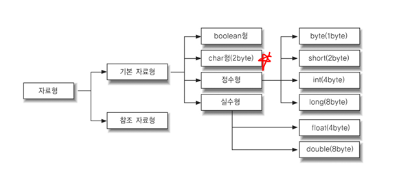 크게 기본 자료형과 참조 자료형으로 나뉘는데, 참조 자료형의 경우 객체 개념에 대한 이해가 선행되어야 하므로 여기서는 우선 '기본 자료형'과 문자/문자열의 구분을 위한 'String'만 다룬다.