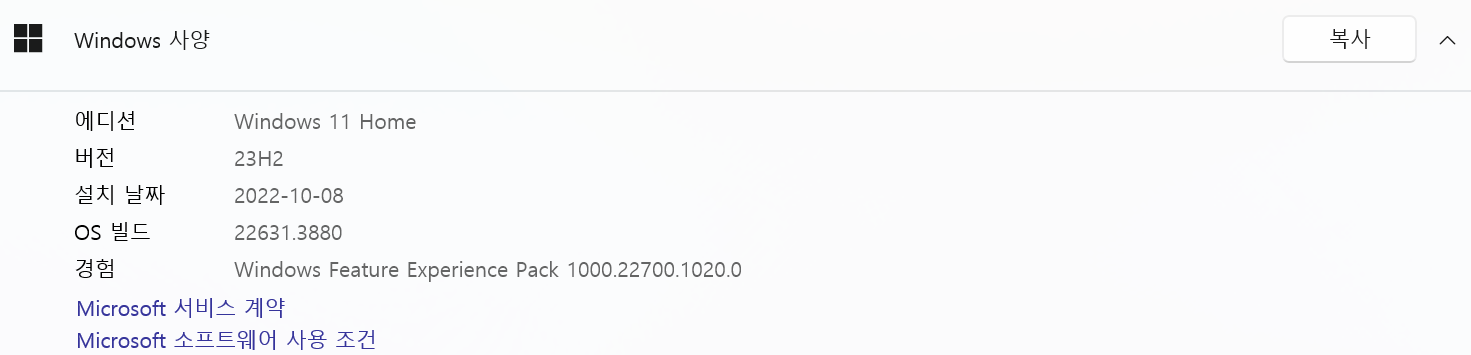 시스템 → 정보에 들어가면 아래와 같이 Windows 사양을 확인할 수 있다.