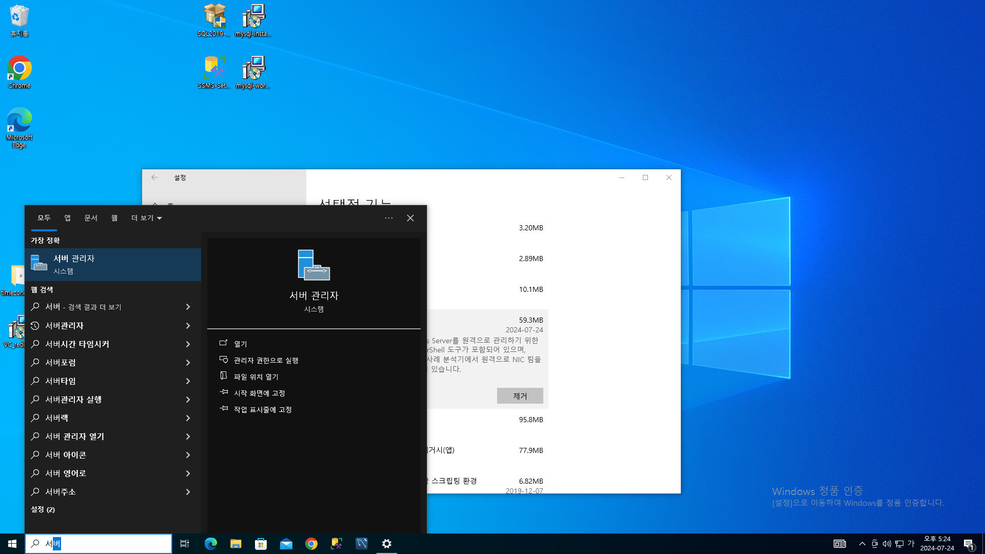 설치가 완료 되면 이렇게 시작 메뉴에서 서버 관리자를 검색해 열 수 있게 된다.