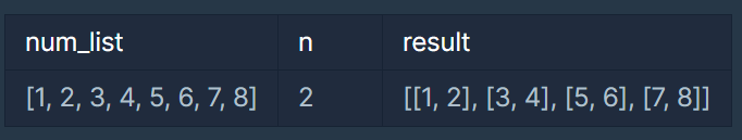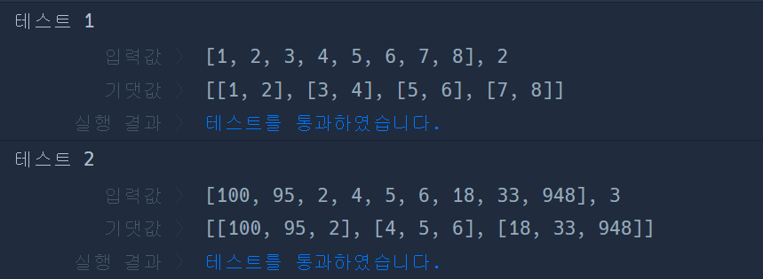 정수 배열 num_list와 정수 n이 매개변수로 주어집니다. num_list를 다음 설명과 같이 2차원 배열로 바꿔 return하도록 solution 함수를 완성해주세요.