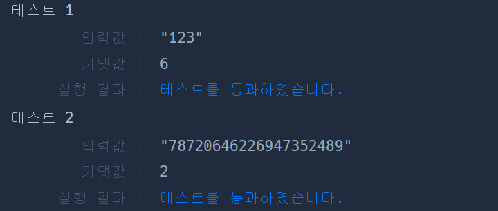 그런데 두 번째 테스트 케이스 통과에 '실행한 결괏값 0이 기댓값 2과 다릅니다.'를 이유로 실패했다. 그래서 입출력 예시와 같이 주어진 정수의 각 자릿수 값들을 더한 다음 9로 나눈 나머지를 return하는 방식으로 코드를 바꾸었다.