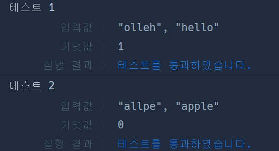 문자열 before와 after가 매개변수로 주어질 때, before의 순서를 바꾸어 after를 만들 수 있으면 1을, 만들 수 없으면 0을 return 하도록 solution 함수를 완성해보세요.