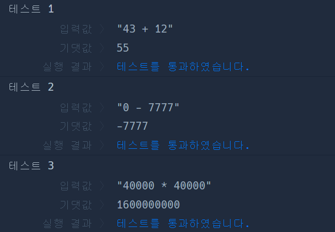 문자열 binomial이 매개변수로 주어집니다. binomial은 "a op b" 형태의 이항식이고 a와 b는 음이 아닌 정수, op는 '+', '-', '*' 중 하나입니다. 주어진 식을 계산한 정수를 return 하는 solution 함수를 작성해 주세요.