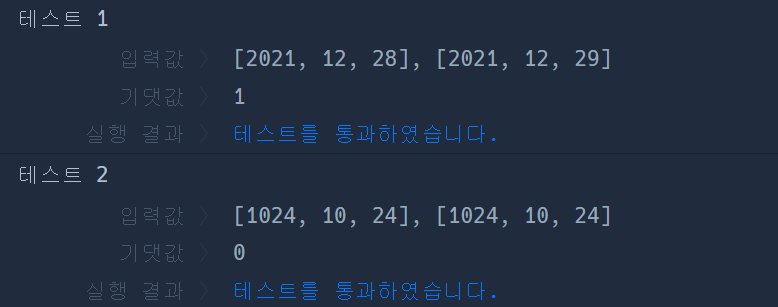 만약 date1이 date2보다 앞서는 날짜라면 1을, 아니면 0을 return 하는 solution 함수를 완성해 주세요.