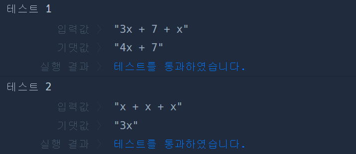 한 개 이상의 항의 합으로 이루어진 식을 다항식이라고 합니다. 다항식을 계산할 때는 동류항끼리 계산해 정리합니다. 덧셈으로 이루어진 다항식 polynomial이 매개변수로 주어질 때, 동류항끼리 더한 결괏값을 문자열로 return 하도록 solution 함수를 완성해보세요. 같은 식이라면 가장 짧은 수식을 return 합니다.