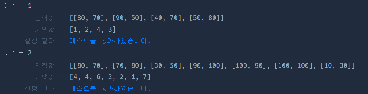 영어 점수와 수학 점수의 평균 점수를 기준으로 학생들의 등수를 매기려고 합니다. 영어 점수와 수학 점수를 담은 2차원 정수 배열 score가 주어질 때, 영어 점수와 수학 점수의 평균을 기준으로 매긴 등수를 담은 배열을 return하도록 solution 함수를 완성해주세요.