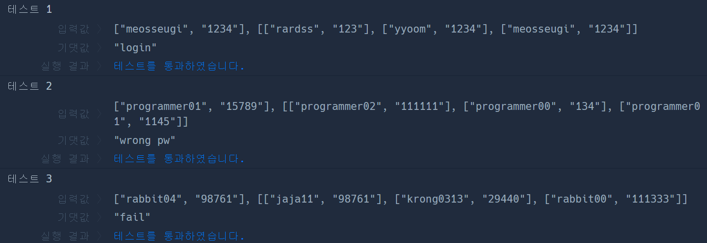 머쓱이는 프로그래머스에 로그인하려고 합니다. 머쓱이가 입력한 아이디와 패스워드가 담긴 배열 id_pw와 회원들의 정보가 담긴 2차원 배열 db가 주어질 때, 다음과 같이 로그인 성공, 실패에 따른 메시지를 return하도록 solution 함수를 완성해주세요.