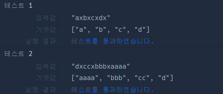 엄청 간단한 문제라고 생각했는데, 테스트 케이스는 통과하는데 제출하니까 전부 실패라는 거다. 주어진 입출력 예제인 axbxcxdx, dxccxbbbxaaaa와 달리, x가 2개 이상인 문자열을 처리해야 하는구나 생각하게 되었다. 그제서야 보이는 빈 문자열은 반환할 배열에 넣지 않는다는 문장ㅜ