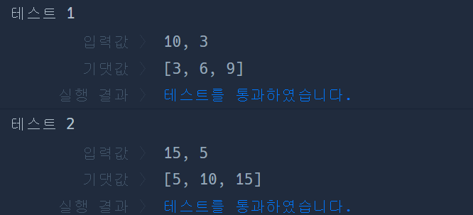 정수 n과 k가 주어졌을 때, 1 이상 n이하의 정수 중에서 k의 배수를 오름차순으로 저장한 배열을 return 하는 solution 함수를 완성해 주세요.