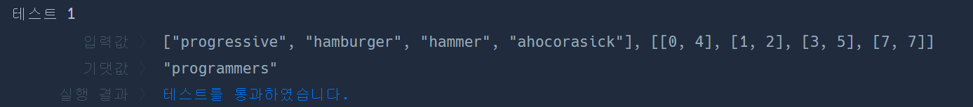 길이가 같은 문자열 배열 my_strings와 이차원 정수 배열 parts가 매개변수로 주어집니다. parts[i]는 [s, e] 형태로, my_string[i]의 인덱스 s부터 인덱스 e까지의 부분 문자열을 의미합니다. 각 my_strings의 원소의 parts에 해당하는 부분 문자열을 순서대로 이어 붙인 문자열을 return 하는 solution 함수를 작성해 주세요.