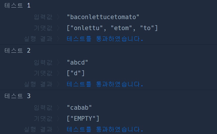 split()을 이용하면 배열에 빈 문자열도 담기기 때문에 이를 없애 주기 위해 확장 for문으로 배열을 돌면서 빈 문자열이 아닌 경우에만 List 객체에 담아주었다. 그리고 3번 케이스처럼 a, b, c로만 이루어져 List 객체에 담긴 게 없는 경우에는 {"EMPTY"}를 반환한다.