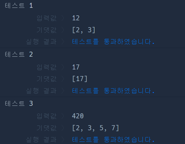 마지막으로 List의 size가 0이라면 자기 자신을 추가해 주는 것으로 (ex. 17) 소인수 구하기를 끝낸다. 반환 타입에 맞게 list 객체의 요소를 정수형 배열에 담아 주면 끝!