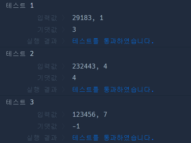 정수 num과 k가 매개변수로 주어질 때, num을 이루는 숫자 중에 k가 있으면 num의 그 숫자가 있는 자리 수를 return하고 없으면 -1을 return 하도록 solution 함수를 완성해보세요.