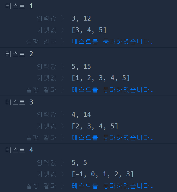 등차수열의 합을 구하는 위 공식을 활용해 시작값을 구한 다음, num 크기의 배열을 선언, 루프를 돌며 각 방에 시작값 + i를 더해준다. iterator인 i를 더해주는 이유는 위 등차 수열 합 공식을 보면 알 수 있다.