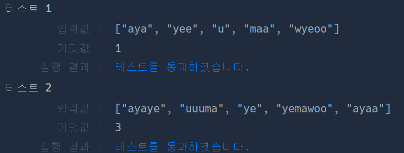 머쓱이는 태어난 지 6개월 된 조카를 돌보고 있습니다. 조카는 아직 "aya", "ye", "woo", "ma" 네 가지 발음을 최대 한 번씩 사용해 조합한(이어 붙인) 발음밖에 하지 못합니다. 문자열 배열 babbling이 매개변수로 주어질 때, 머쓱이의 조카가 발음할 수 있는 단어의 개수를 return하도록 solution 함수를 완성해주세요.