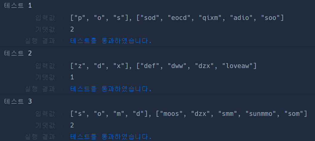단어가 dic에 하나라도 존재한다면 1을 return하면 되므로 if문 안에 바로 return 1을 명시했고, 그렇지 않으면 for문을 다 돌고 난 뒤 return 2 하도록 했다.