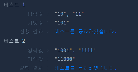 이진수를 의미하는 두 개의 문자열 bin1과 bin2가 매개변수로 주어질 때, 두 이진수의 합을 return하도록 solution 함수를 완성해주세요.