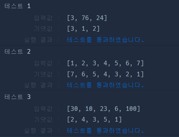 외과의사 머쓱이는 응급실에 온 환자의 응급도를 기준으로 진료 순서를 정하려고 합니다. 정수 배열 emergency가 매개변수로 주어질 때 응급도가 높은 순서대로 진료 순서를 정한 배열을 return하도록 solution 함수를 완성해주세요.