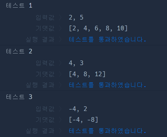 함수 solution은 정수 x와 자연수 n을 입력 받아, x부터 시작해 x씩 증가하는 숫자를 n개 지니는 리스트를 리턴해야 합니다. 다음 제한 조건을 보고, 조건을 만족하는 함수, solution을 완성해주세요.