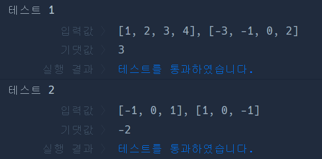 이때, a와 b의 내적은 a[0]*b[0] + a[1]*b[1] + ... + a[n-1]*b[n-1] 입니다. (n은 a, b의 길이)