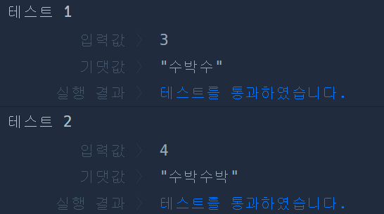 길이가 n이고, "수박수박수박수...."와 같은 패턴을 유지하는 문자열을 리턴하는 함수, solution을 완성하세요. 예를들어 n이 4이면 "수박수박"을 리턴하고 3이라면 "수박수"를 리턴하면 됩니다.